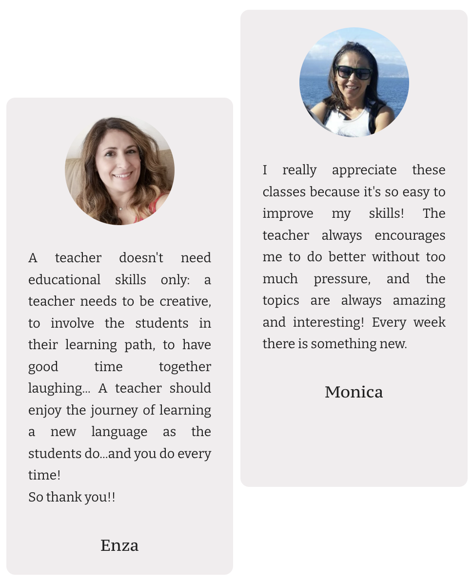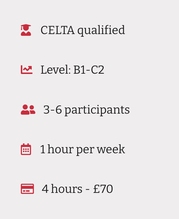 Simply get in touch with me and I will personally assess your speaking and choose the best group for you based on your level and personality.